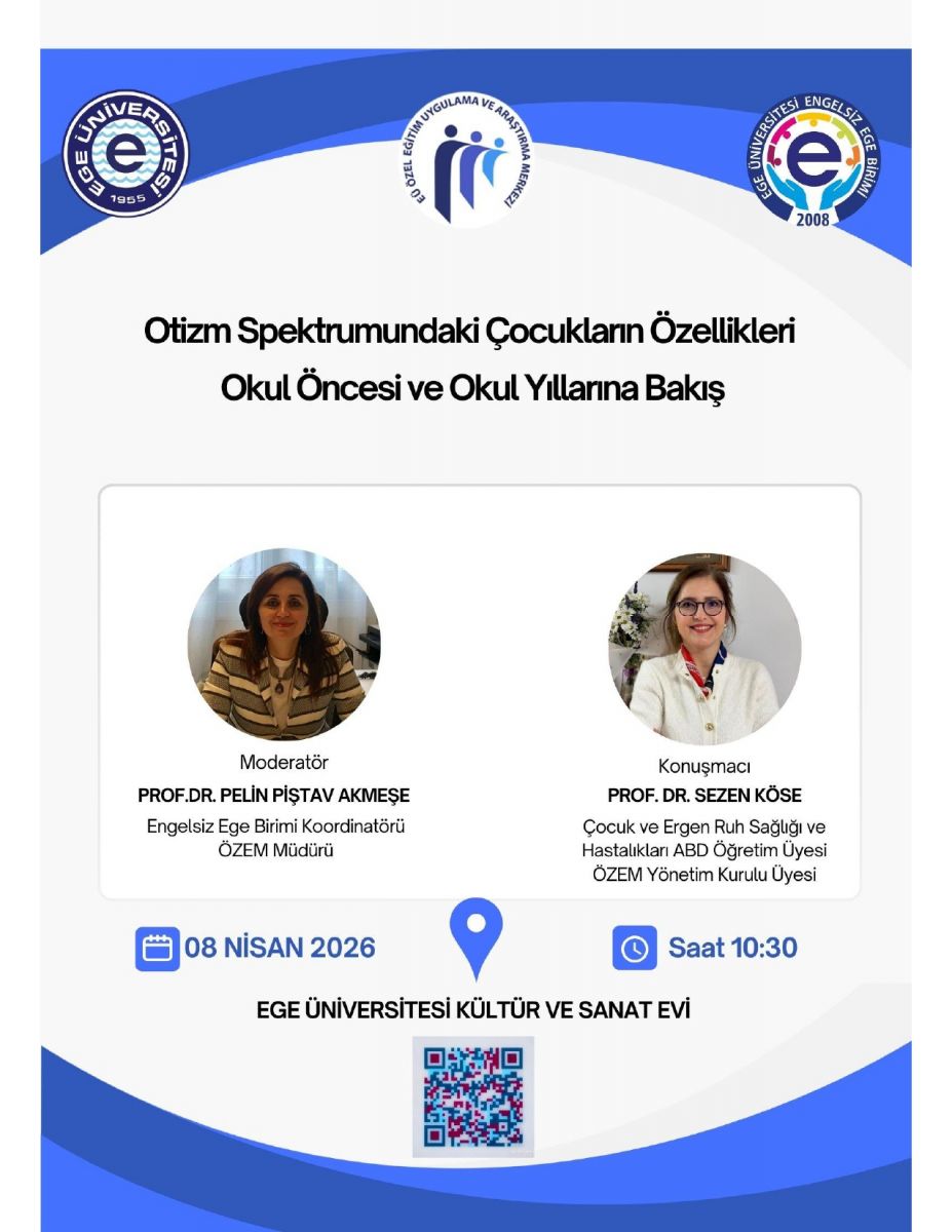 Ege Üniversitesi Engelsiz Ege Birim Koordinatörü ve ÖZEM Yönetim Kurulu Üyesi Prof. Dr. Pelin PİŞTAV AKMEŞE Moderatörlüğünde Otizm devamı..